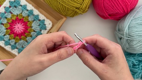 - Start with a lighter pink yarn. Make a slip knot and chain 4.