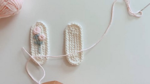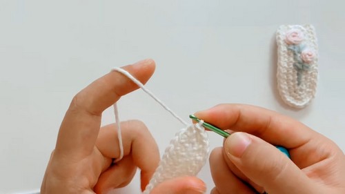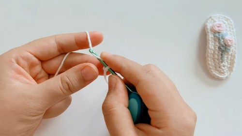 - In the next four chains, work one single crochet into the first chain and two single crochets together into the second chain. Repeat this twice.