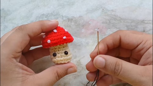 - Embroider the white spots onto the mushroom cap using the French knot technique and white yarn.