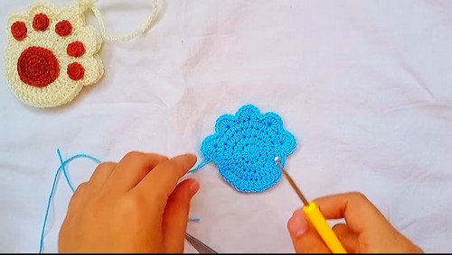 - Use the longer yarn tail to sew each paw onto the pouch.