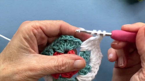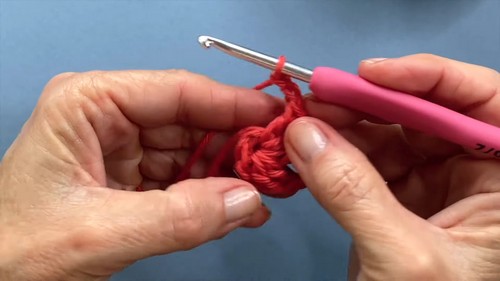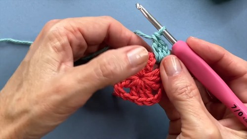 - To complete the round, instead of chaining 2, do a half double crochet into the top of the first chain 3.