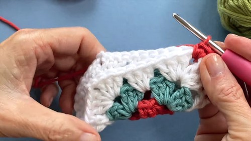- In each corner space: 3 double crochets, chain 2, 3 double crochets.