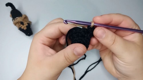 - Start in brown with 5 sc, switch to black, 3 sc, chain 7, work 6 hdc back along the chain, join with a sc to the start of the tail.