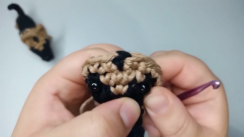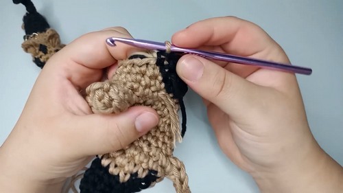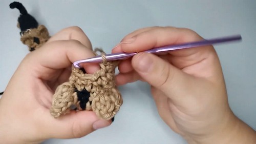 - Introduce brown yarn, 3 sc in brown, switch to black, 2 increases in black, switch to brown, 1 increase in brown, switch to black, 2 increases in black, 4 sc in brown (17 sts).