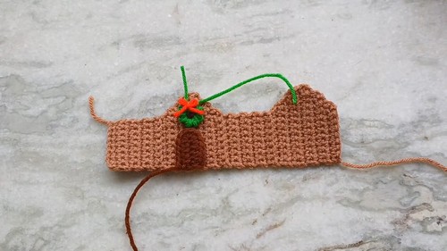 - The door is made with dark brown yarn by chaining 7 and then working half-double crochets creating a small rectangular panel.