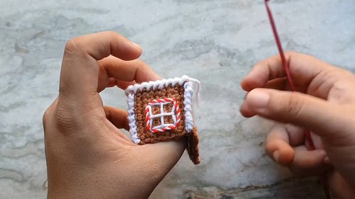 - Candy cane stripes around the door and windows are made by twisting red and white yarn strands together.
