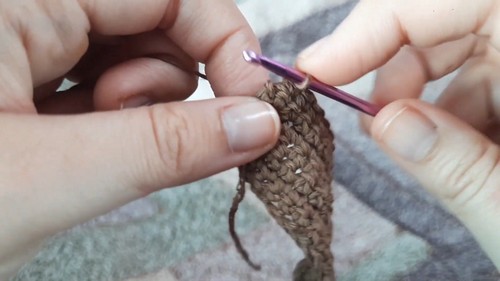 - Start decreasing by skipping stitches and making single crochets in successive rows to shape the leg.