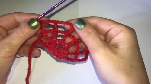 - Chain one, and in the same chain space, add four more triple crochets (making a total of five triple crochets into the same hole, with chain ones in between each).