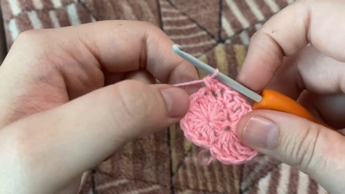 - In the chain-3 corner space: 2 double crochets, chain 3, 2 double crochets.