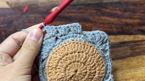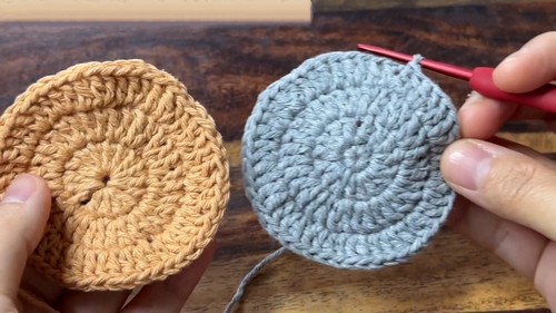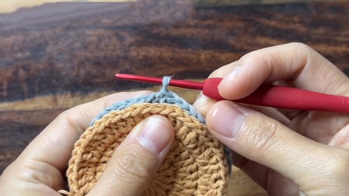 - Holding both circles together, insert the hook into any back loop of a stitch from both pieces.