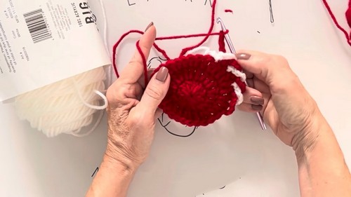 - This begins your peppermint stripe edging. Ensure to pull up a loop and secure it so it does not unravel when changing colors.