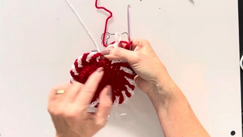 - Attach your second color with a slip stitch in the next stitch from where you left off. Chain 5 and continue this process, alternating colors each time to create the peppermint stripe effect. Ensure to work in a way that prevents the yarn from tangling by properly managing your yarn strands.