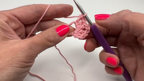 - Attach a new color in any chain-two space, chain three (counts as the first double crochet).
