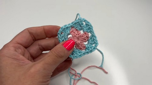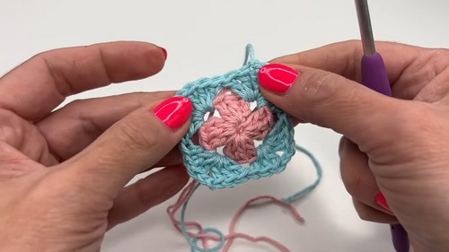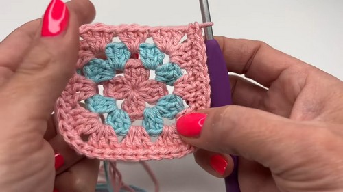 - Work two more double crochets in the same space, followed by three double crochets, chain two, and three more double crochets in the next chain-two space (corner creation).