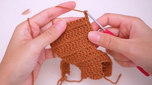 - Insert the hook and work eight single crochets on row 5 of the body, followed by the written pattern.