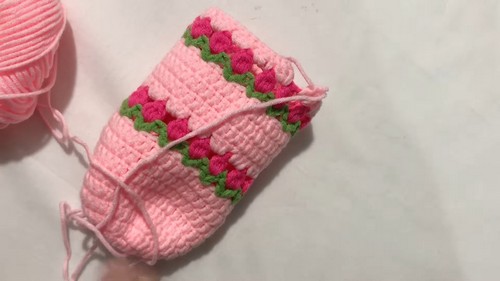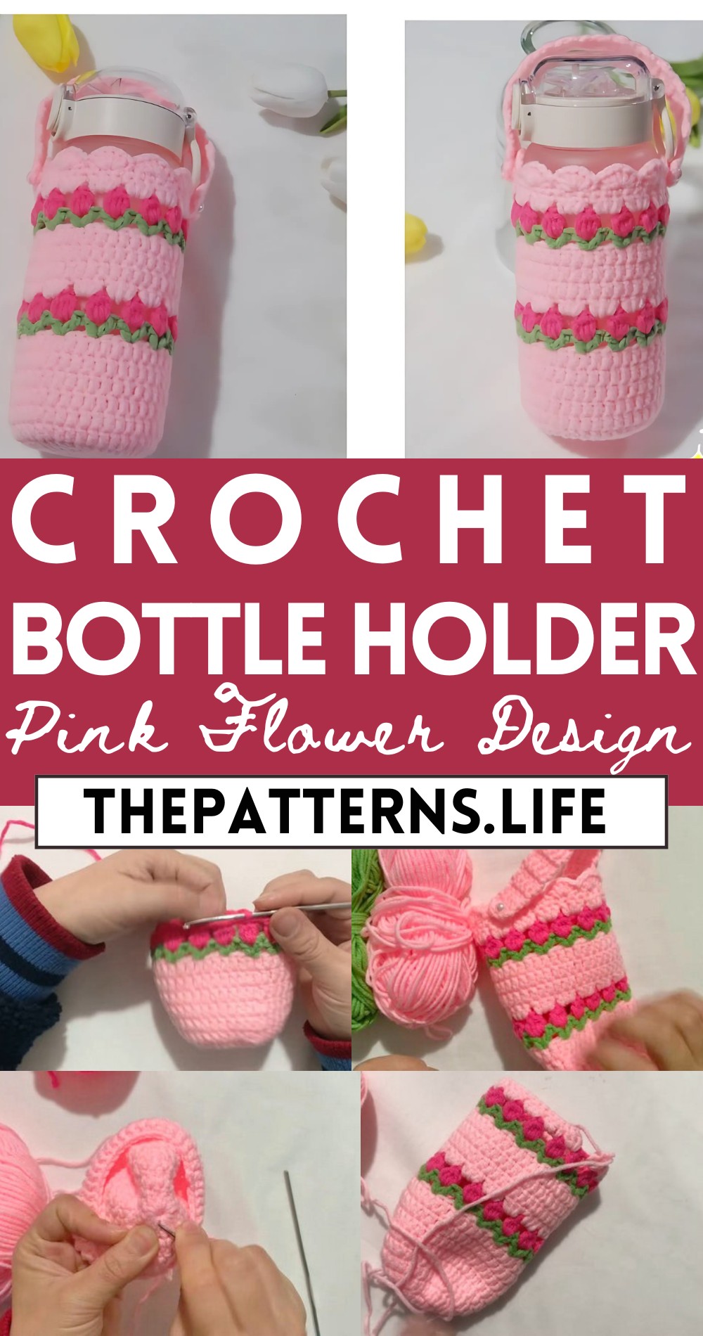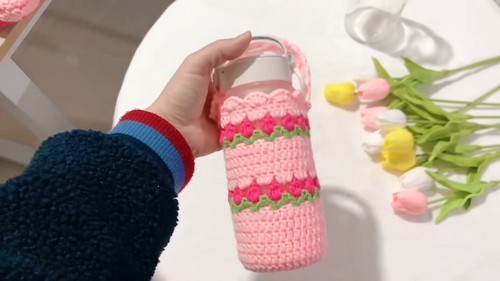 Stylish Crochet Water Bottle Holder Pattern With Pink Flower