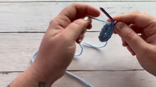 - Chain nine, sc, hdc, and dc in prescribed pattern for shaping the fin