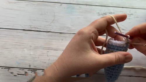 - Perform a color change for the tummy, making sure to work into the 3rd loop from the hdc