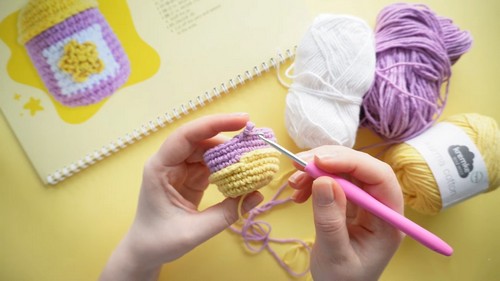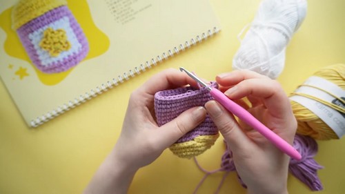 - 12 single crochets in purple, change to white, 8 single crochets in white, change back to purple, 12 single crochets in purple; repeat this pattern for 6 rounds.