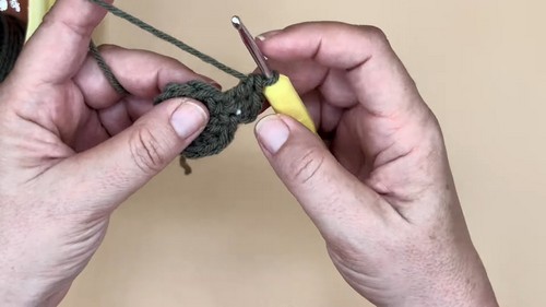 - Perform 10 double crochets in the third chain from the hook.