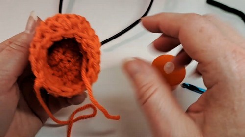 - Thread a small piece of yarn through the top of the pumpkin crochet piece. Tie it around the base of the pipe cleaner stem to attach it to the pumpkin.