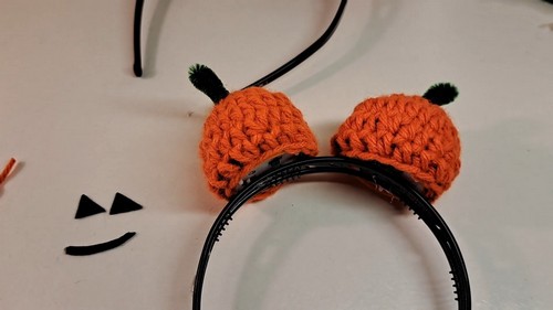 - Use hot glue to attach the felt features to the crochet pumpkin, forming a jack-o’-lantern face (this step is optional).