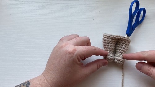 - Join legs by arranging them correctly and start single crocheting around both legs, which should total 24 stitches.