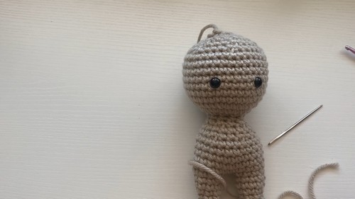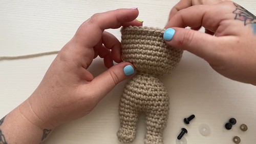 - Rounds 22-28: 1 sc in each stitch around (36 stitches). Place safety eyes between rounds 6 and 7 of the head, spaced 6 stitches apart. Continue to stuff the head firmly as you go.