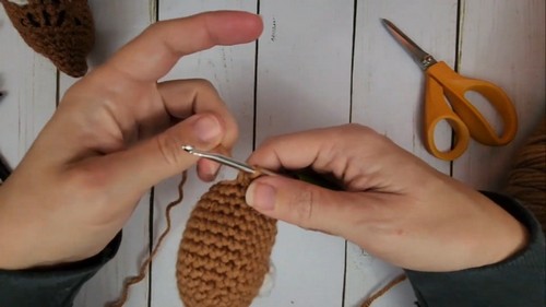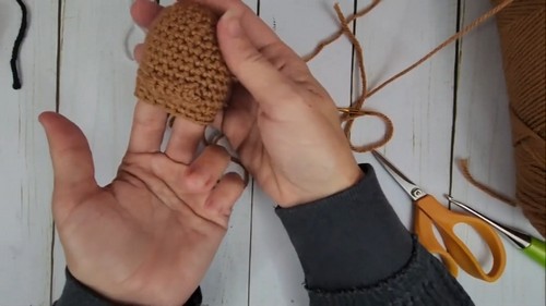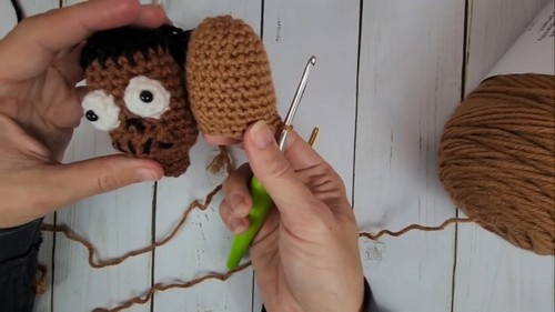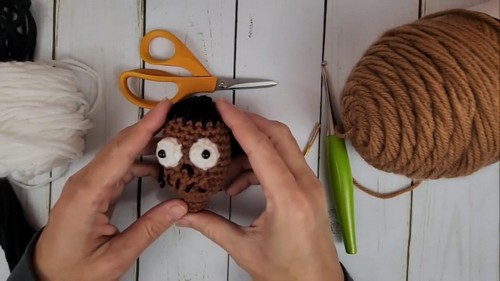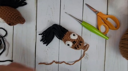 - Once the head is shaped and stuffed, attach the hair using strands of brown yarn; you can create hair by looping the yarn through stitches on the head and securing them.