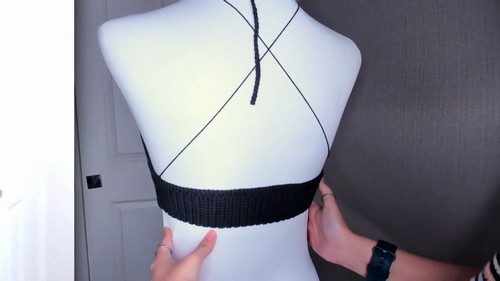 - Create a chain or use a strong yarn strand for lacing. Start from the bottom front, thread through the spaces created, crossing at the chest, over the shoulders, and tying at the back, or as preferred for ease of wear.