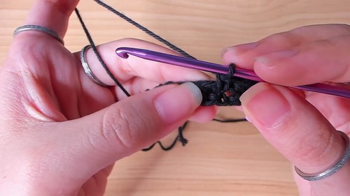 - In the last chain, work two additional single crochets (making three single crochets in the last chain). Mark the second single crochet with a stitch marker.