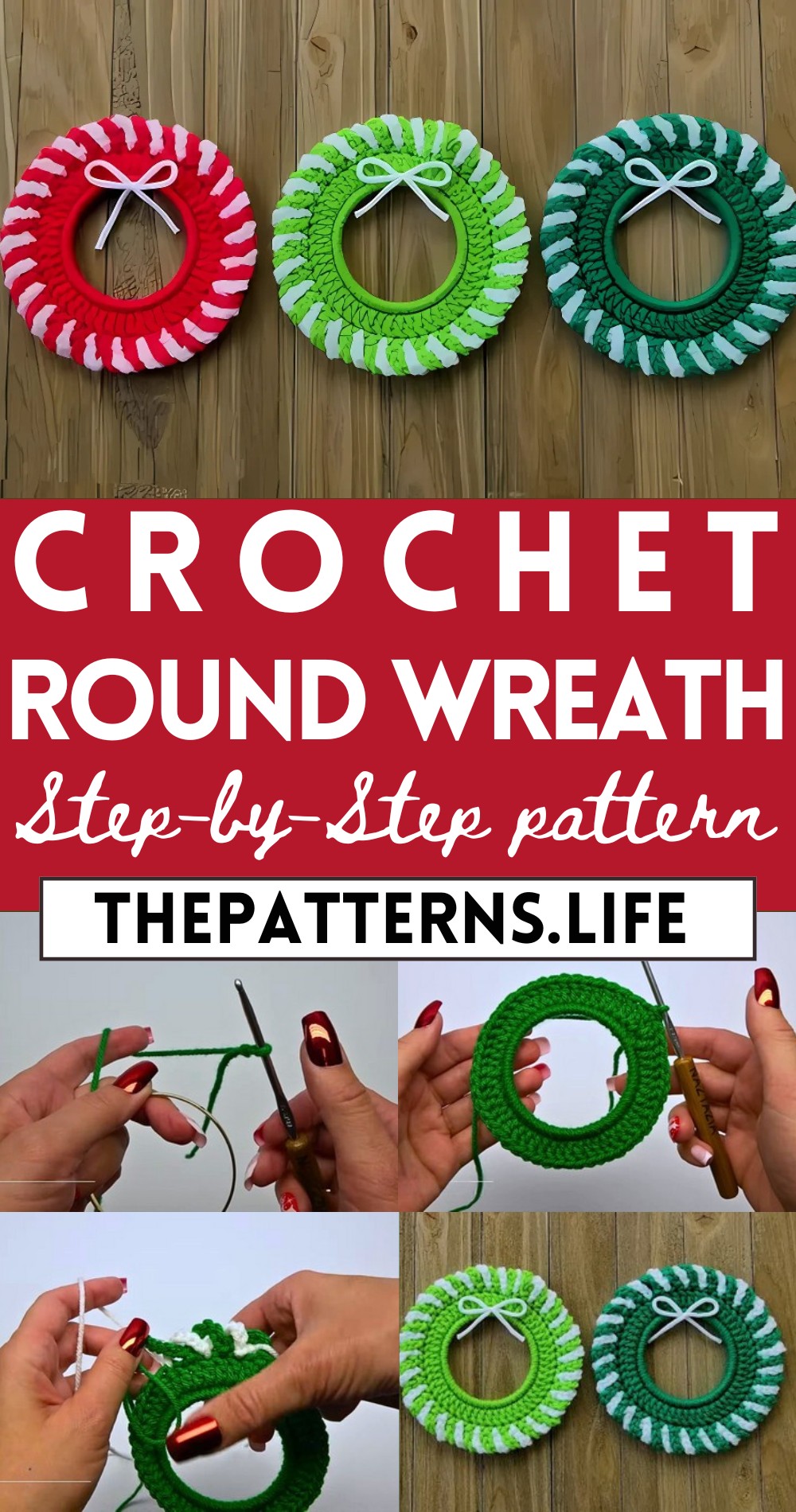 - Repeat Round 3 with the second color of yarn, alternating between the two colors until you have gone all the way around the wreath.