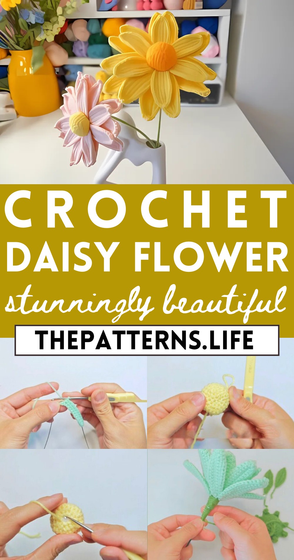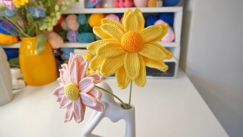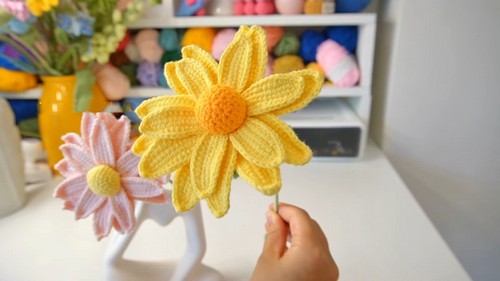Incorporate a hint of shimmer by using metallic yarn for a touch of sparkle in your daisies.
