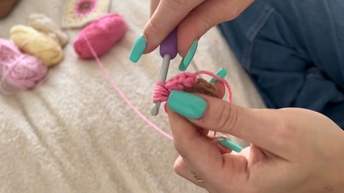 - Wrap yarn around your fingers to create a loop, insert the hook, and pull up a loop. Chain one to secure.