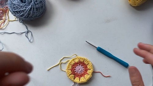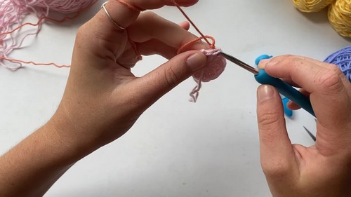 - Make 11 more double crochets into the circle, totaling 12 double crochets.