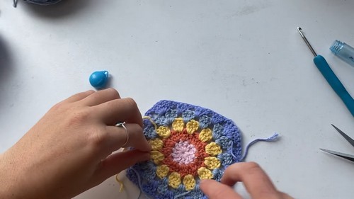 - For the first square’s second round, do 3 double crochets into each existing stitch around the circle, with slip stitches to join and chain ones in between.