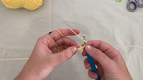 - Wrap the yarn over your two fingers, twist, then pull through another piece of yarn.