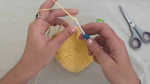 - Repeat the pattern of turning your work, chaining two, and working HDCs into each stitch. When you reach the stitch with the stitch marker, work 3 HDCs into it. Move the stitch marker into the middle HDC of this new cluster after each row.