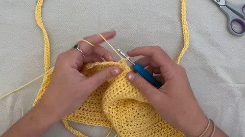 - Work a row of single crochets along the bottom edge of each cup, putting the hook through clear spaces at the top part of the stitches. Ensure an odd number of stitches by the end.