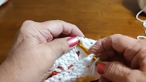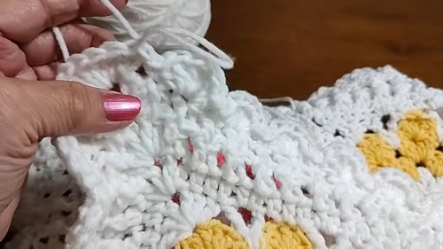 - Use white yarn, insert your hook through both corners of the squares and attach your yarn using your preferred method.