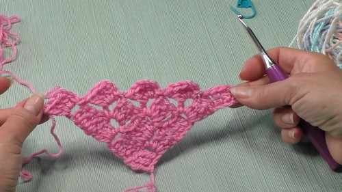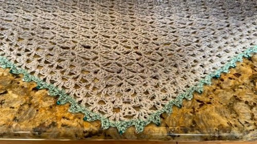 - Start the border by chaining 3 (counts as a double crochet) at the edge of the shawlette.