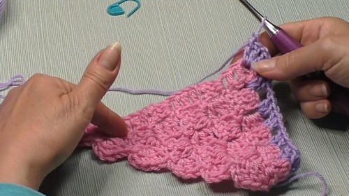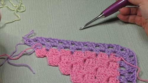 - Complete each block by adding 3 double crochets into the same chain 3 space.